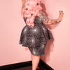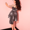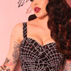 Get ready to slay in style with our Glamour Girl Peplum Dress in Black and White Spiderweb! This versatile wiggle dress has a removable peplum skirt, so you can wear it in multiple ways. The dress is made of cotton sateen, and covered in a vintage-inspired spiderweb print by Miche line Pitt. Features a gathered rhinestone bust detail, and a red satin lining. Thick adjustable straps, a back zipper, and a button closure on the peplum skirt finish off the look. Perfect for Halloween, this dress will add a spooky touch to your wardrobe!