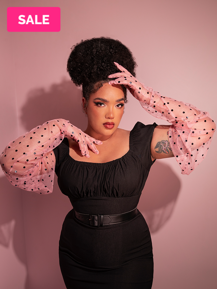PRE-ORDER - 1950s Satin Wiggle Sundress and Scarf in Black Vintage Roses - Vixen by Micheline Pitt