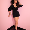 Ashleeta showing off the backside of the Vacation Playsuit in Black Ponte from retro clothing maker Vixen Clothing.