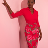 The most dangerous curve-killing pencil skirt out there! Made with the shape of your body to nip in your waist and accentuate your hourglass figure to the max. The Vixen pencil skirt is featured in a vintage reproduction 1950’s rose block print that has been lovingly recreated for Vixen. Since this is produced from heavyweight stretch cotton sateen it has a firmer fit and is fully lined in a stretch silky charmeuse. Finished with a 1.75 inch stretch fused waistband, a back slit and back zip.