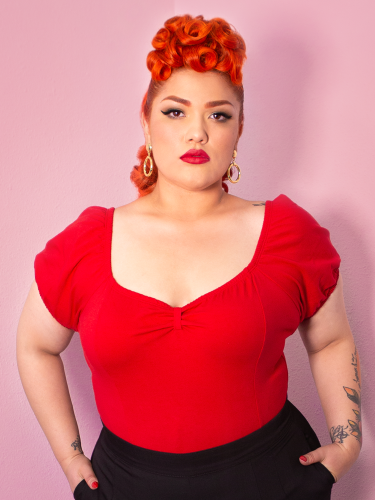 The Powder Puff Top in Red being worn be a female retro clothing model.