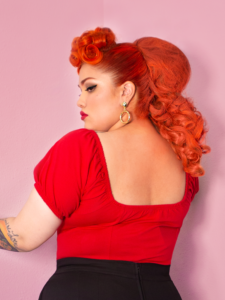 A back shot of Evelyn looking over her shoulder modeling the Powder Puff top in red by Vixen Clothing.