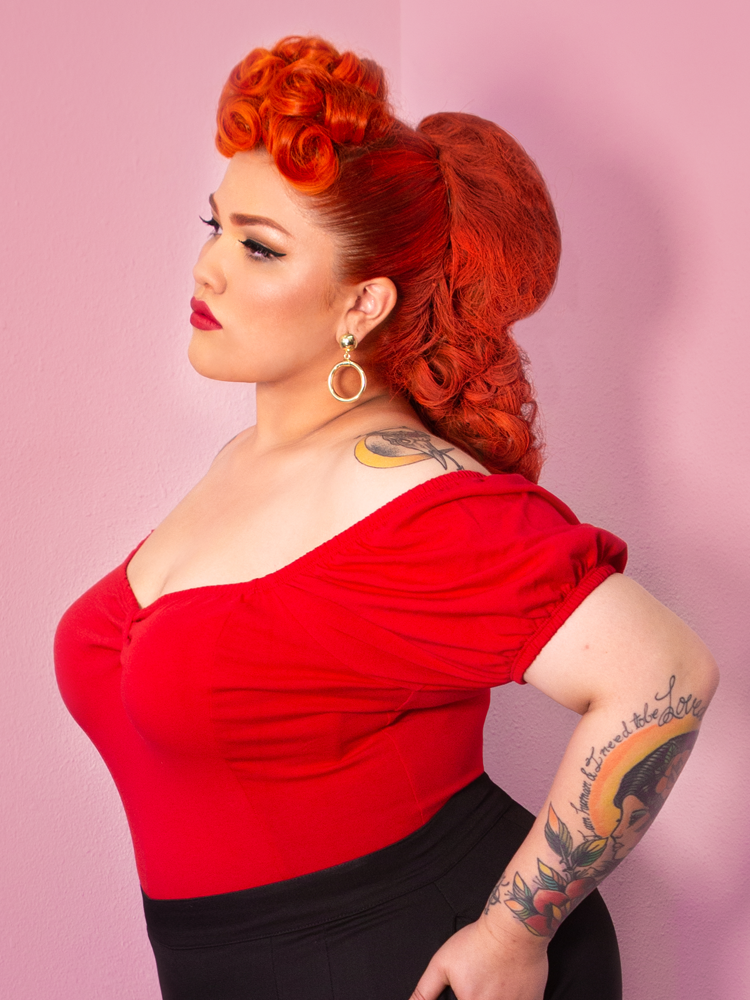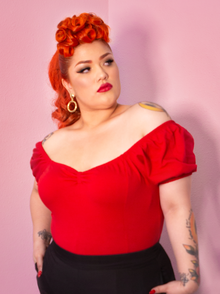 A side shot of Evelyn looking off camera with her hands on her hips modeling the Powder Puff top in red by Vixen Clothing.