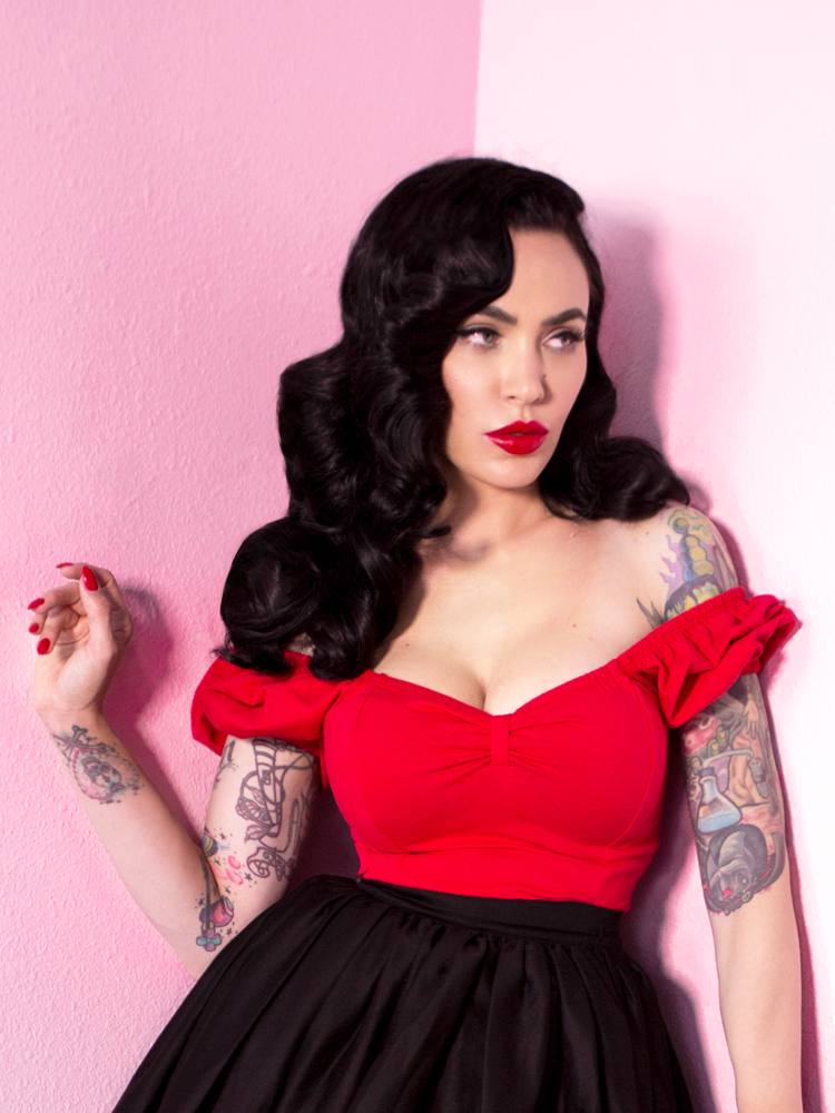 Micheline Pitt looking off camera while modeling the Vixen Clothing Powder Puff top in red.