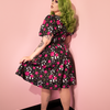 Full length shot of female model wearing the BEETLEJUICE™ Sandworm & Roses Swing Dress with matching black shoes.