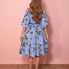 A female model in a vintage inspired dress with sunset blue roses stands in front of a pink wall, softly smiling with hands on hips.