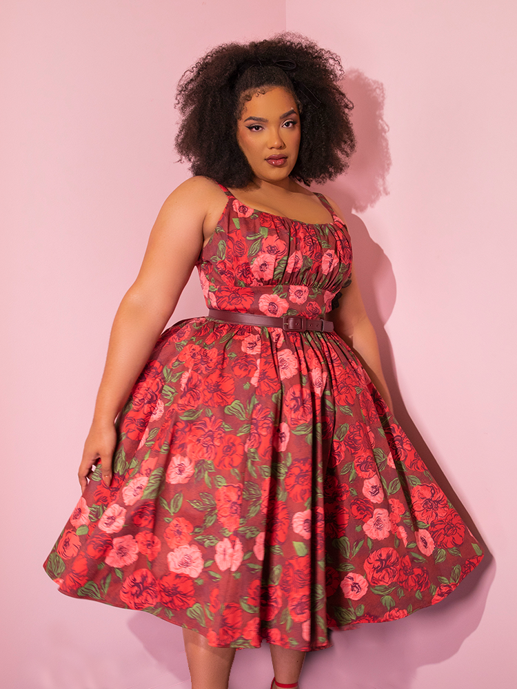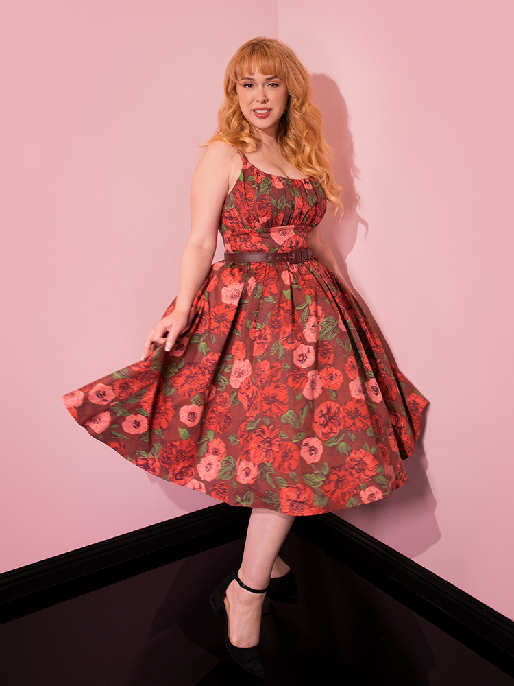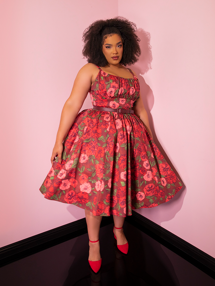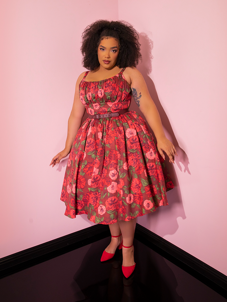 Playfully showcasing the retro spirit, beautiful models strike poses in the Chocolate Rose Print Ingenue Dress from the iconic retro dress brand Vixen Clothing.