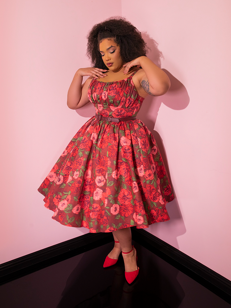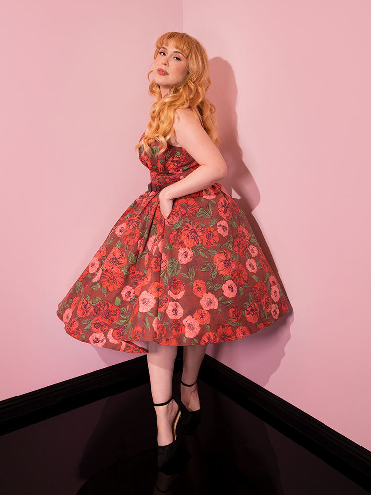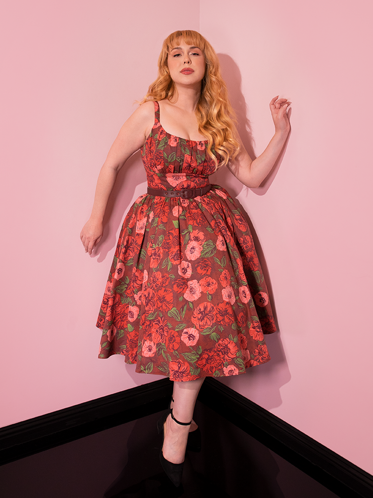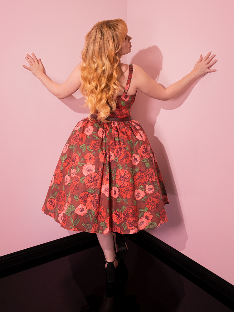Model standing in the corner of a room posing in the Ingenue Dress in Chocolate Rose Print from Vixen Clothing.