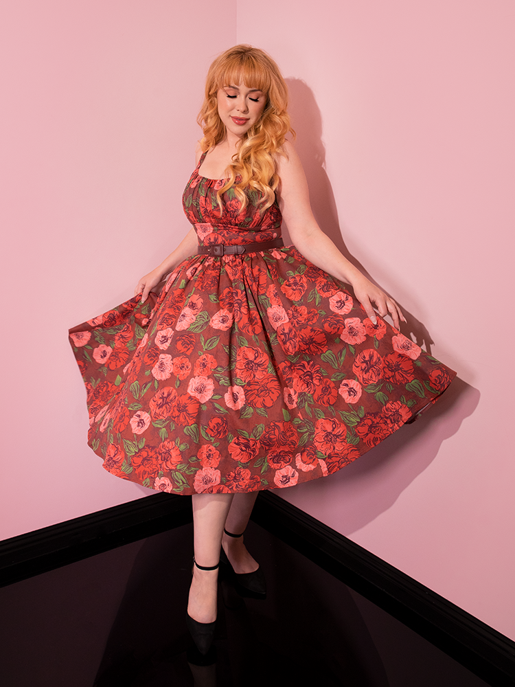 Model twirling around in the Ingenue Dress in Chocolate Rose Print allowing the skirt section to seemingly float.