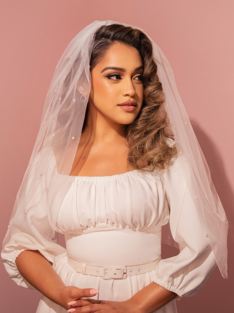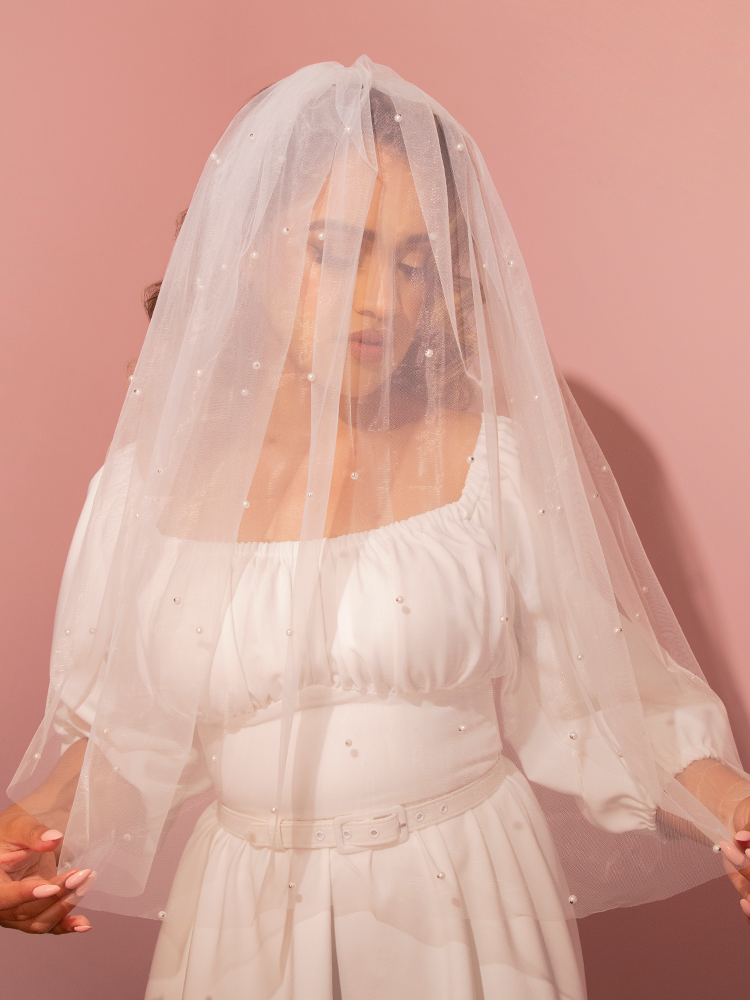 Tulle Veil with Pearl Bead Accents in White Mesh