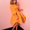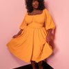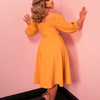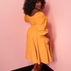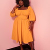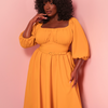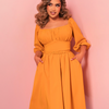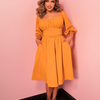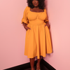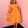 The ultimate sexy 1960s-inspired Vacation Dress is now available in a lush, muted mustard gold color! This dress is perfect for traveling as it is completely wrinkle-resistant and made from the softest highest-quality synthetic gaberdine spandex twill. The bust features a wearable yet sexy elasticized gathered neckline and 3/4 length bishop sleeves for maximum comfort. With a slightly shirred waist that won't add volume, this dress also has convenient pockets. Complete with an invisible back zip and a removable 5/8 inch grommet belt, it's ready for any adventure.