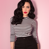 The Bad Girl top is the ultimate vintage inspired 3/4 sleeve top for the modern Vixen! Updated from our old pattern for a more roomy fit. This classic silhouette is beautifully made from a custom heavy yet soft knitted striped cotton/poly/spandex. This piece has no zipper, pulls right on and is a full length so it can be worn in or out of high waisted items. Guaranteed to get you into the right kinds of trouble!