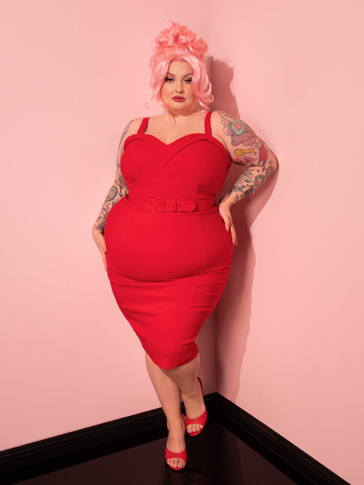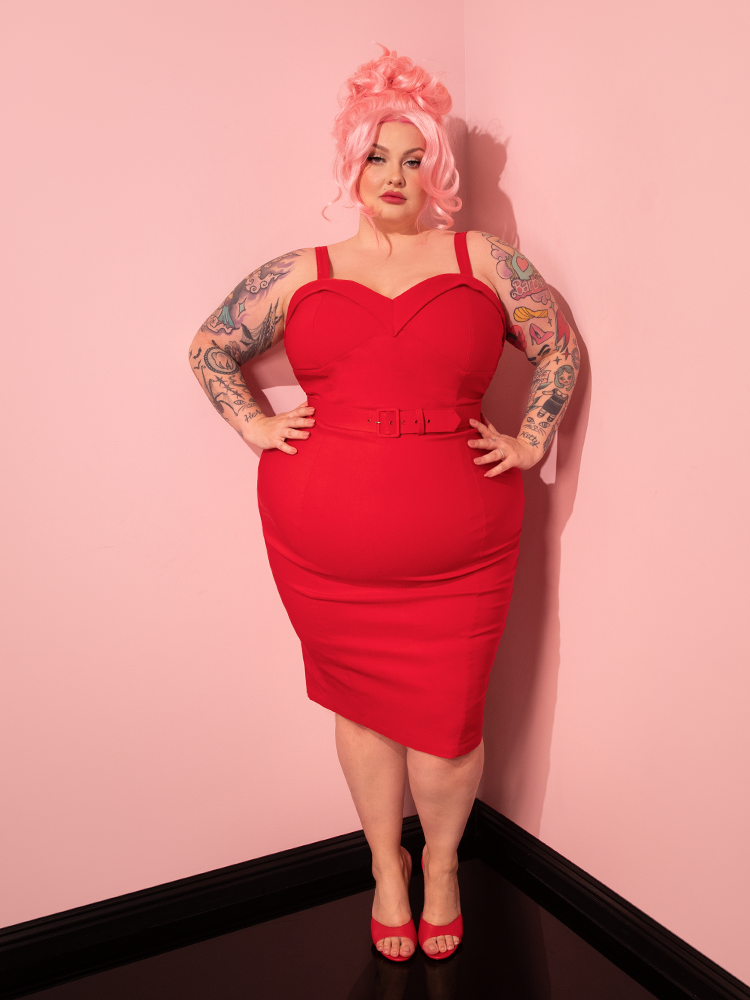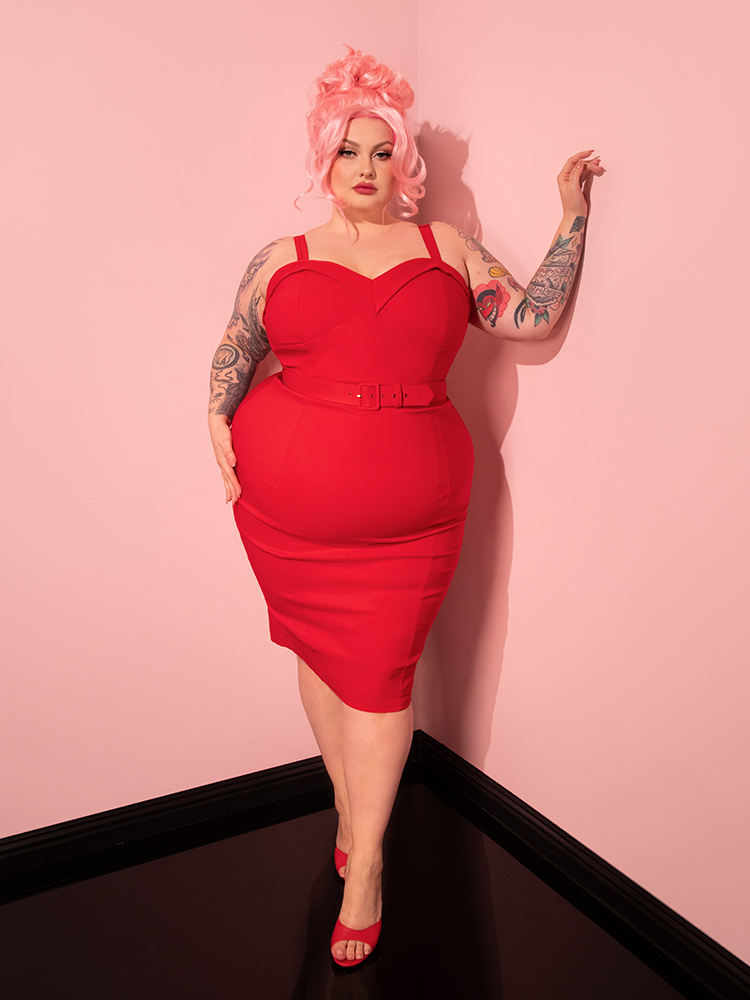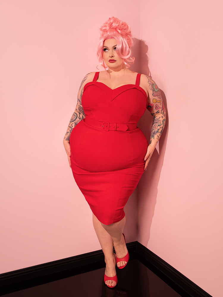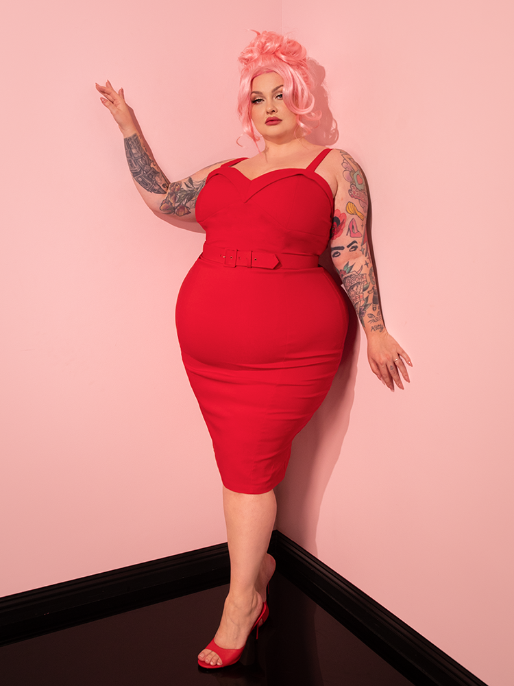 The playful charm of Vixen Clothing comes to life as a gorgeous female model strikes poses in the Maneater Wiggle Dress in Red.