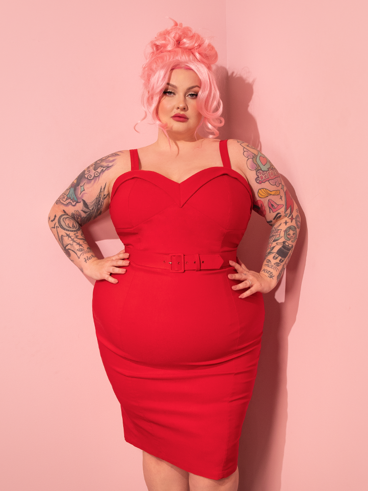 This Maneater Wiggle Dress in Red brings old-school sophistication to the forefront with its vibrant hue and vintage-style design.