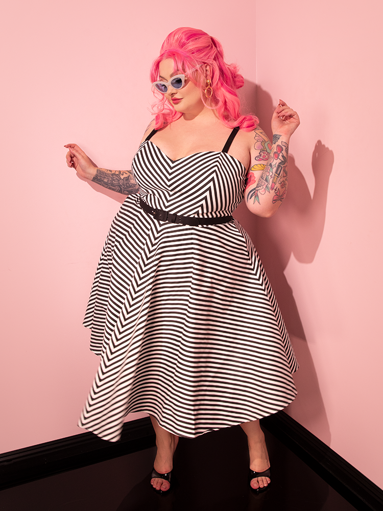 The Dollface Dress in Black and White is a true vintage-inspired gem, complete with a tailored bodice and a full skirt for a feminine silhouette.