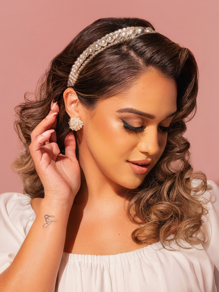 This ivory 3-strand faux pearl and rhinestone headband brings a vintage touch of sophistication, perfect for adding old-school charm to any hairstyle. A chic accessory for weddings or formal occasions.