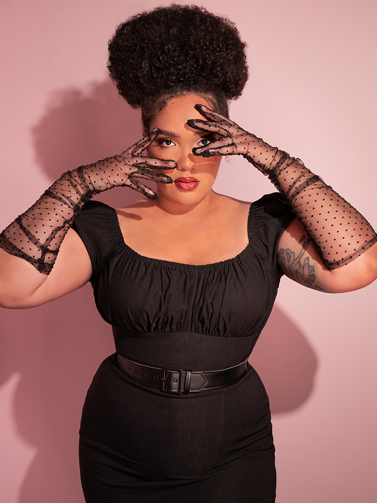 Inspired by a classic 1950's silhouette with a hint of sexy elegance, these gloves are perfect for play and more. These mid length black polka dot gloves are a great way to effortlessly elevate your outfit!
