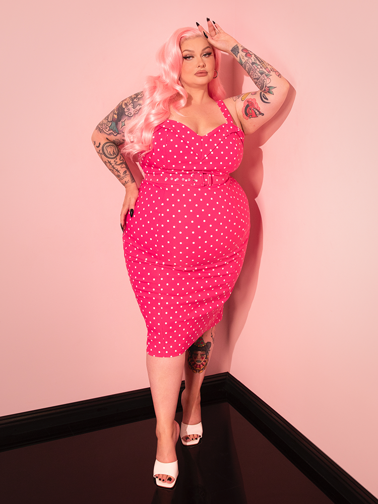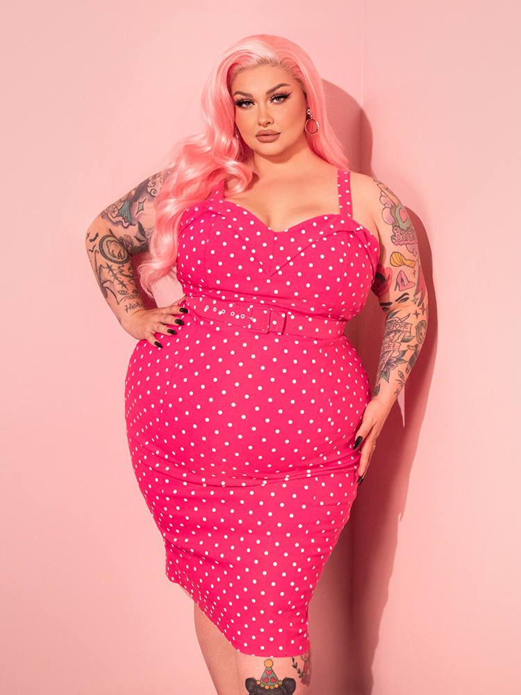 Maneater Wiggle Dress in Hot Pink & White Polka Dot - Vixen by Micheline Pitt