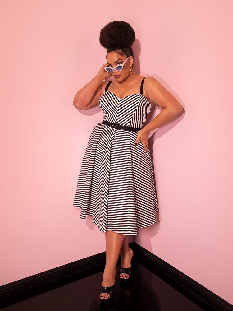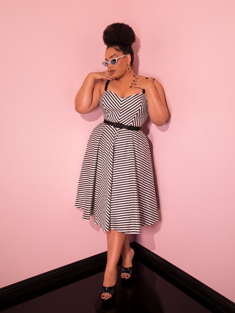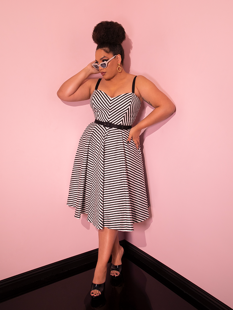 Model posing in the Dollface Dress in Black and White with matching sunglasses from the same line offered by retro clothing brand Vixen Clothing.