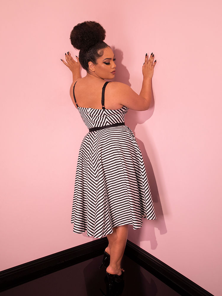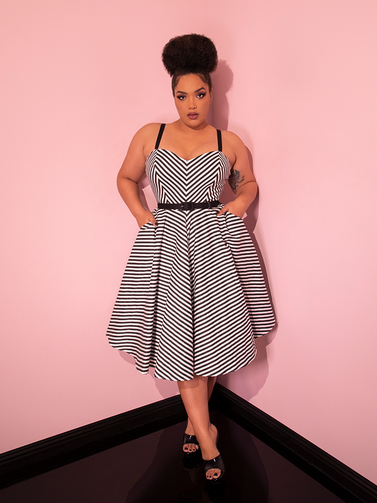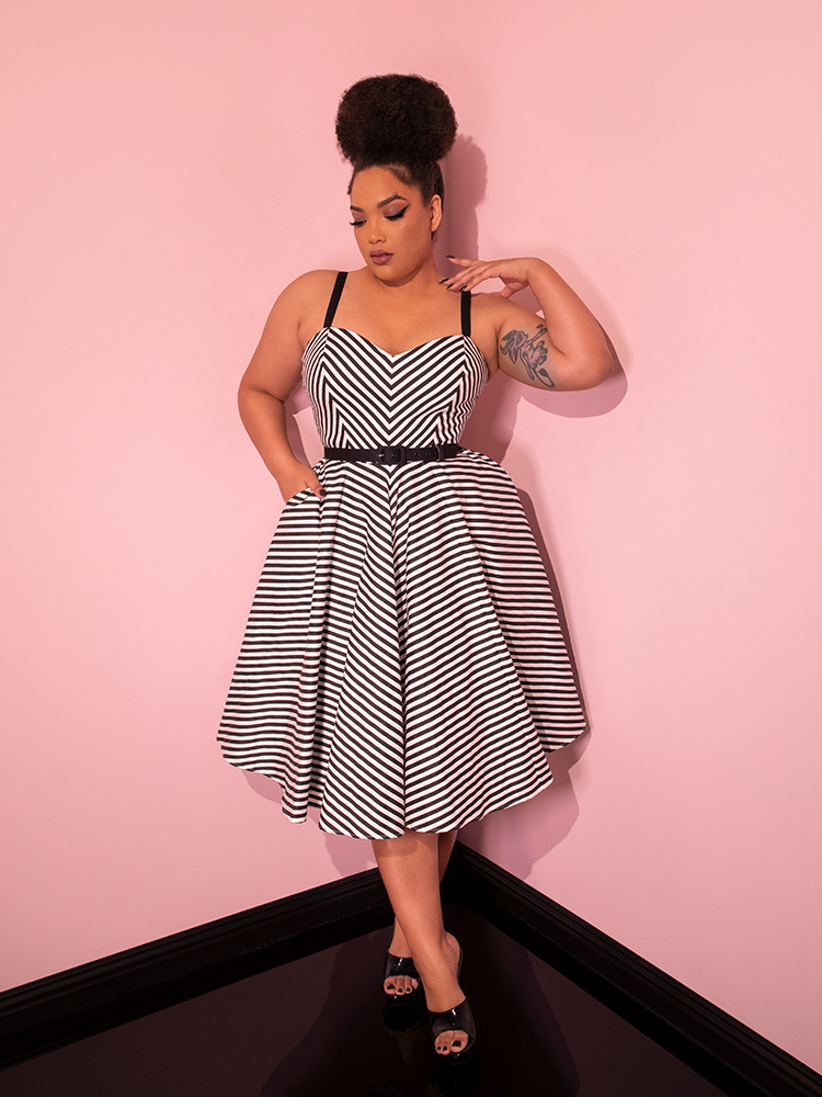 Add a hint of classic Hollywood style to your wardrobe with the Dollface Dress in Black and White, a timeless vintage piece.