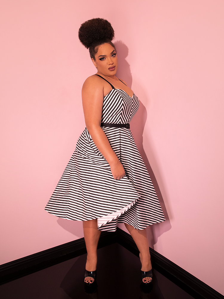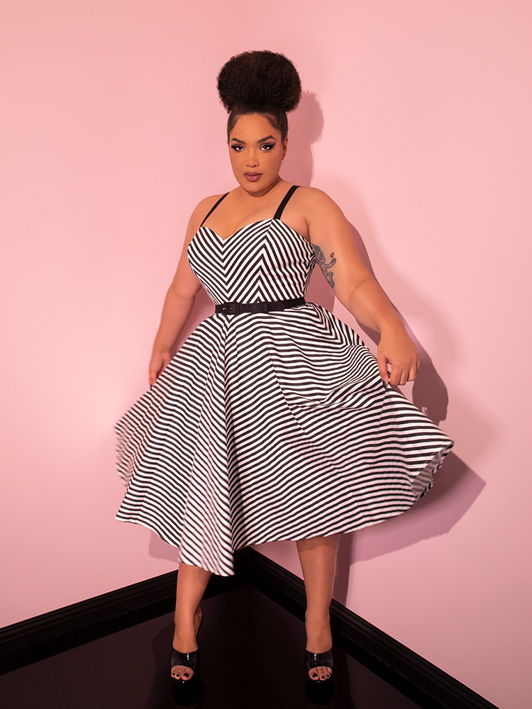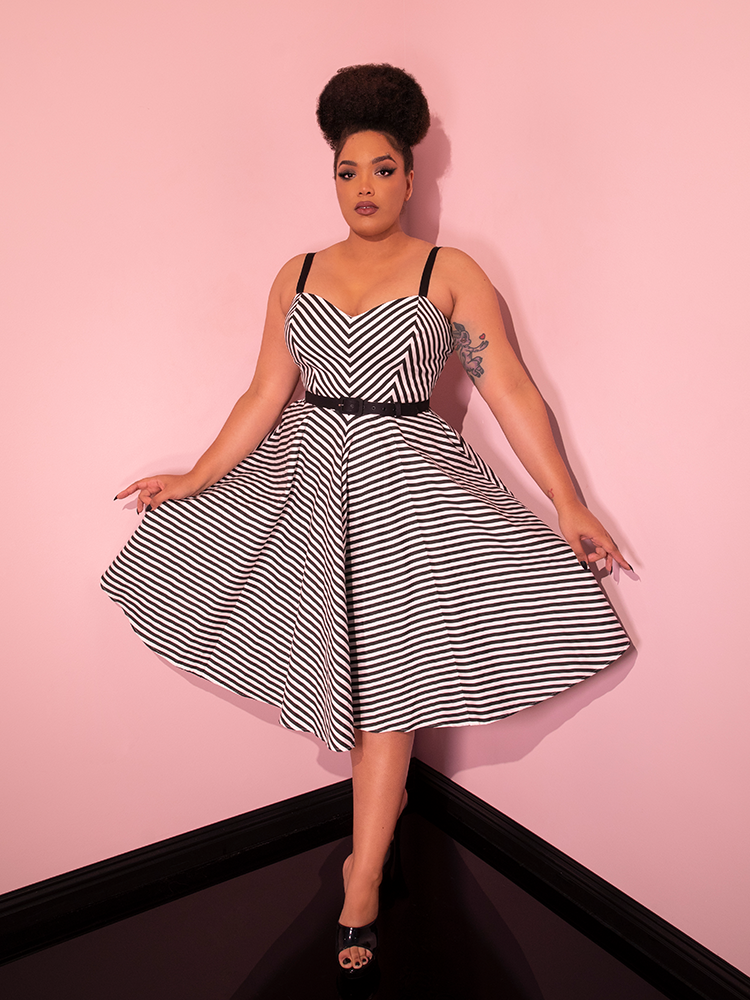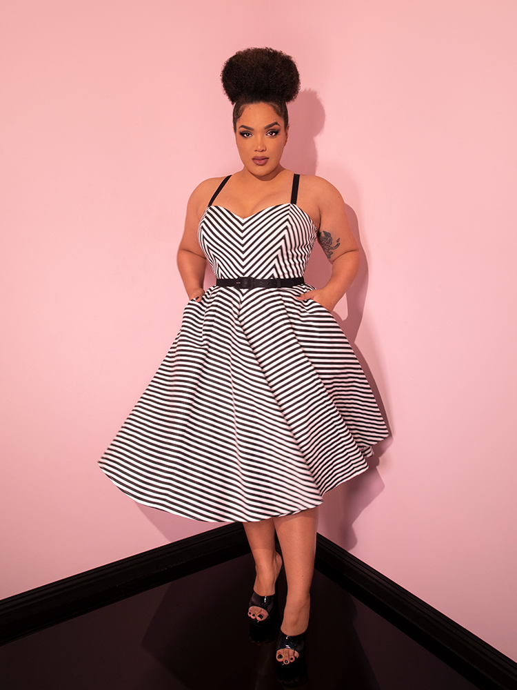 The Dollface Dress in Black and White is a true vintage-inspired gem, complete with a tailored bodice and a full skirt for a feminine silhouette.