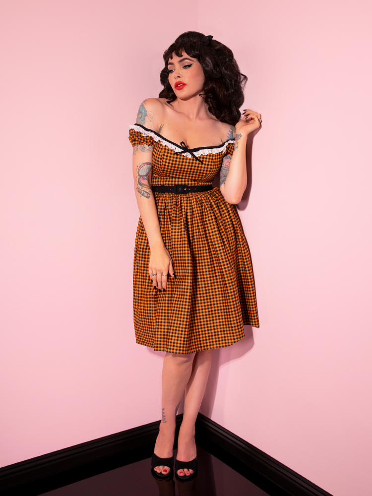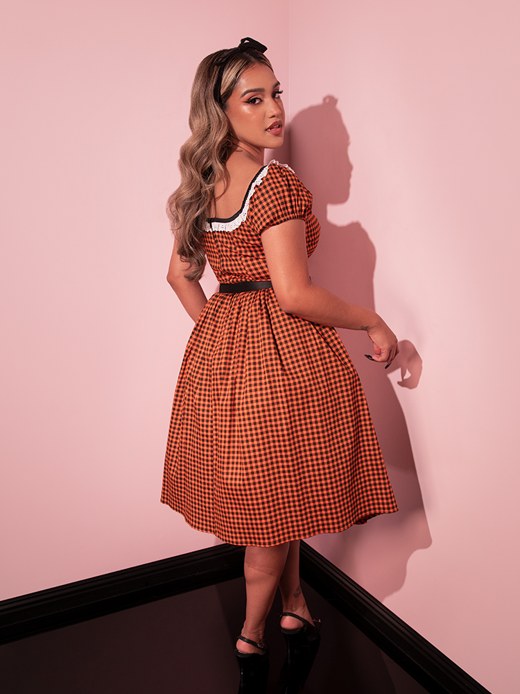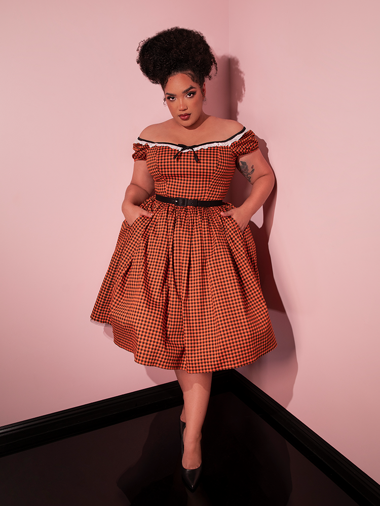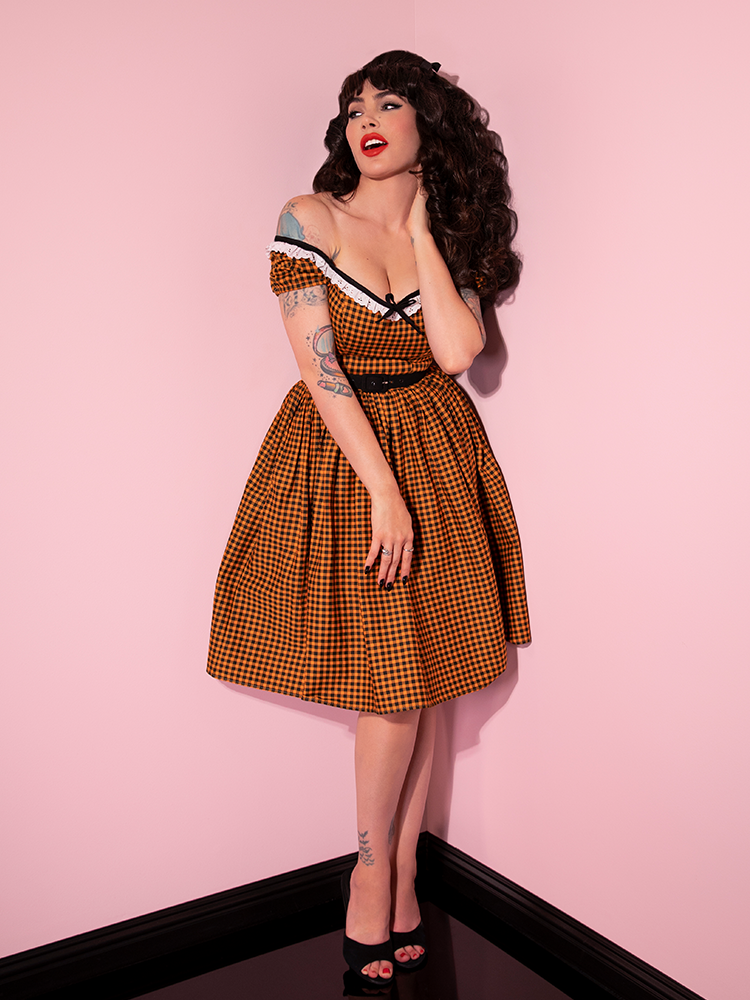This vintage-style swing dress in orange pumpkin gingham is a nod to classic Hollywood fashion.