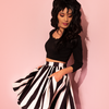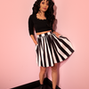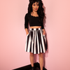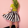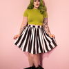 Get your favorite Vixen swing skirt in a new shorter style. This fun and flirty swing silhouette starts at 20 inches from waist to hem and is patterned in bold black and white stripes. Perfect to pair with our BEETLEJUICE™ collection. Finished with hidden side pockets and back zip.