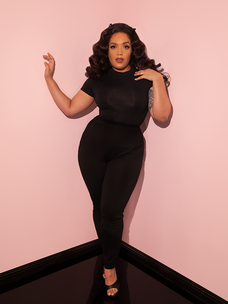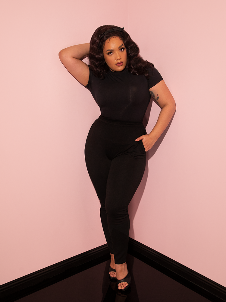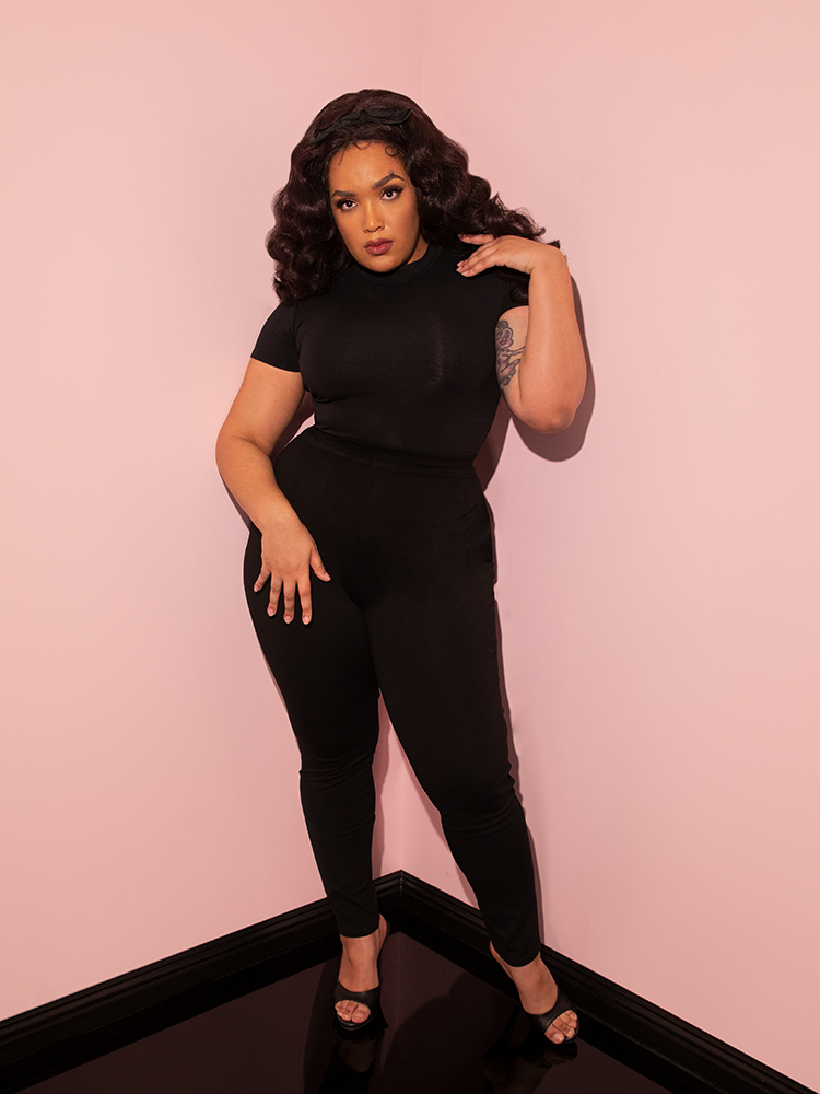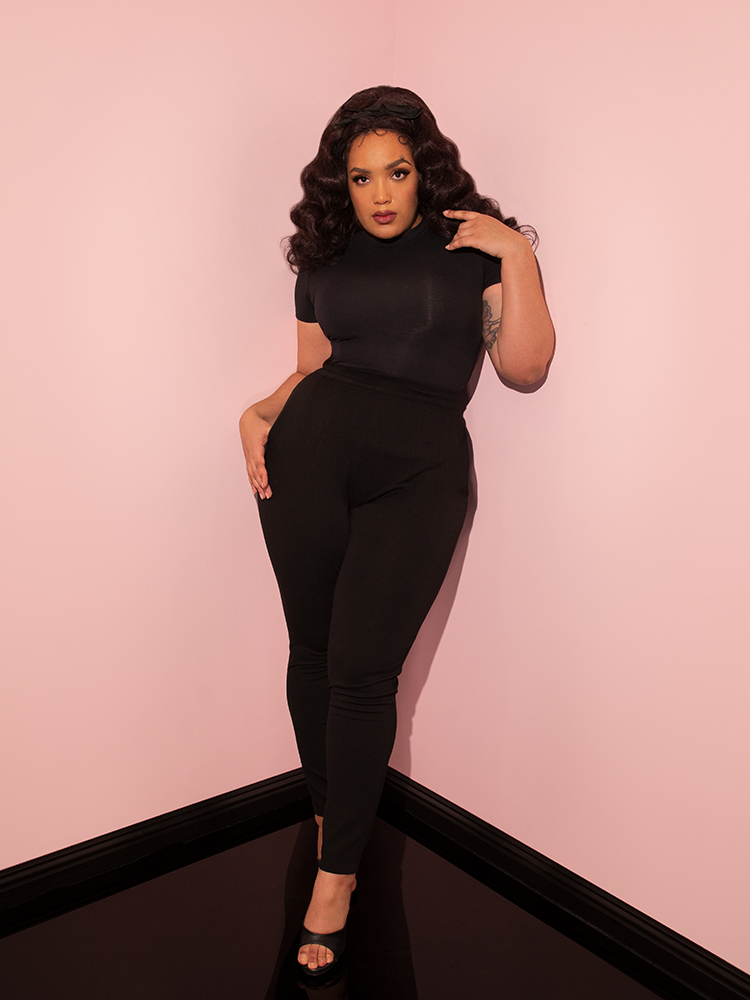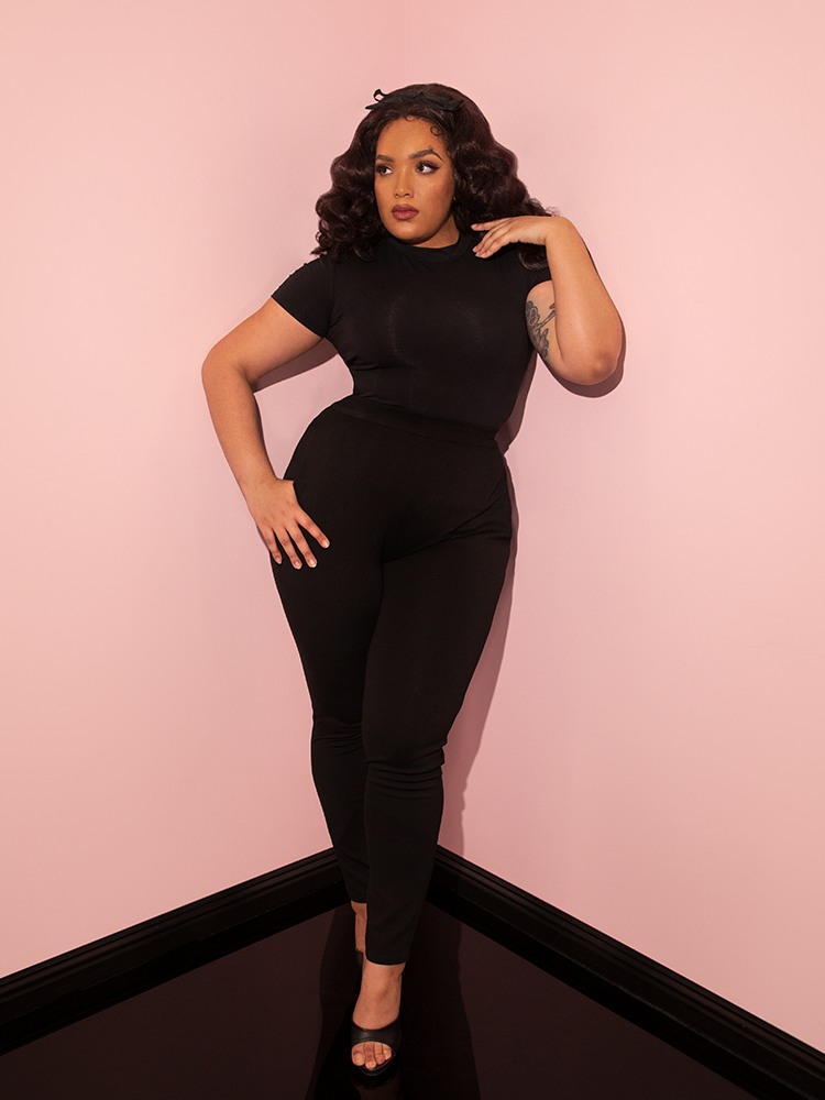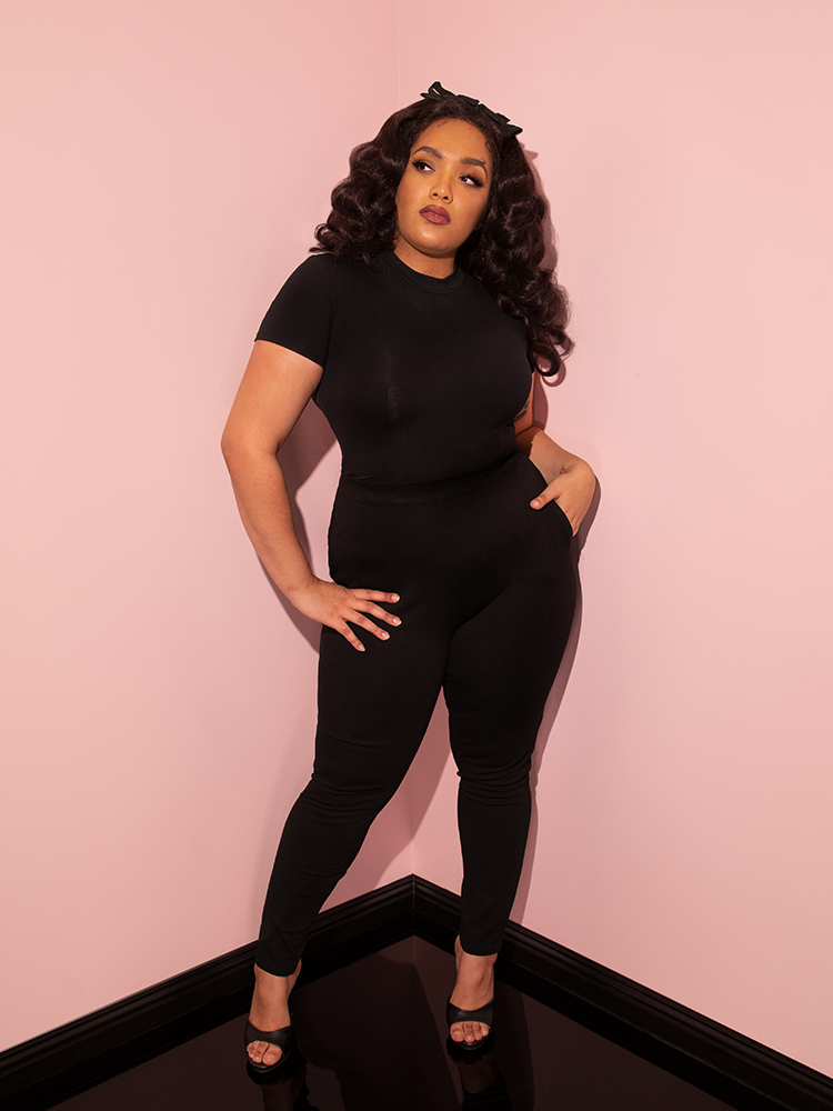 Inspired by a mixture of 1960s and 1980s fashions, this new version of our classic vintage-inspired cigarette pants was made for work or play. These new cigarette pants are produced in a soft Ponte to showcase the shape of the wearer's silhouette while giving you a full range of movement. Made from the softest high-quality nylon/rayon/spandex on the market. Features a YKK zipper and inset pockets that will fit your smartphone. If you love our striped Miss Kitty pants, you will love these as they are made from the same material!