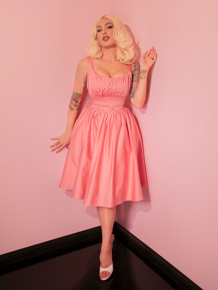 The Ingenue Swing Dress in Blush Pink captures the essence of vintage glamour with its flattering fit and soft, romantic hue.