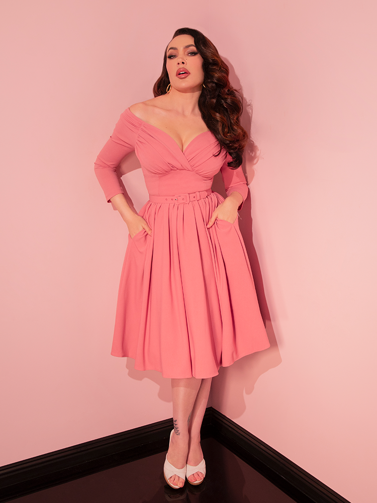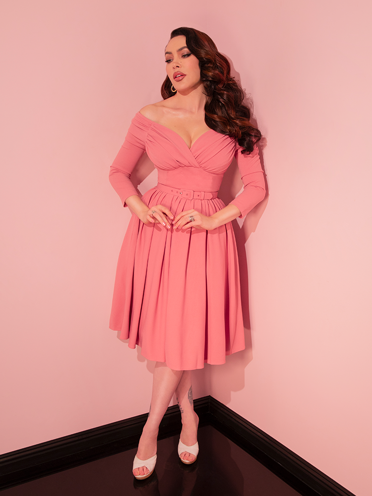 The Starlet Swing Dress in rose pink embodies classic Hollywood glamour, styled in front of a soft pink wall for added romance.