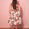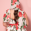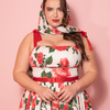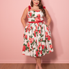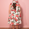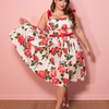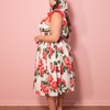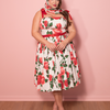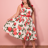 Feel like an old Hollywood movie star in this incredible timeless piece based on an iconic vintage 1950s dress style. Made from white cotton sateen, this dress features a lightly gathered bust, adjustable straps, deep hidden side pockets, a contrasting red satin belt, and a back zippered closure. Comes with a beautiful matching scarf to add that glamour, darling! This red rose print is an authentic reproduction of a classic vintage print and a perfect addition to your spring dress collection!