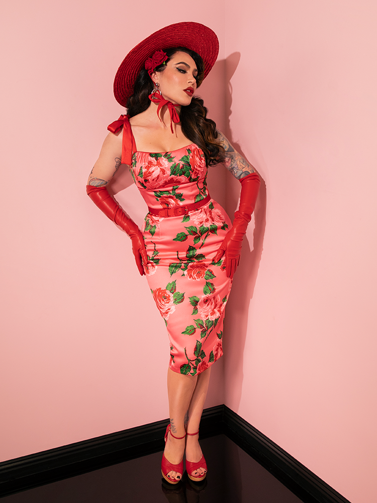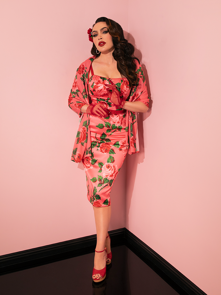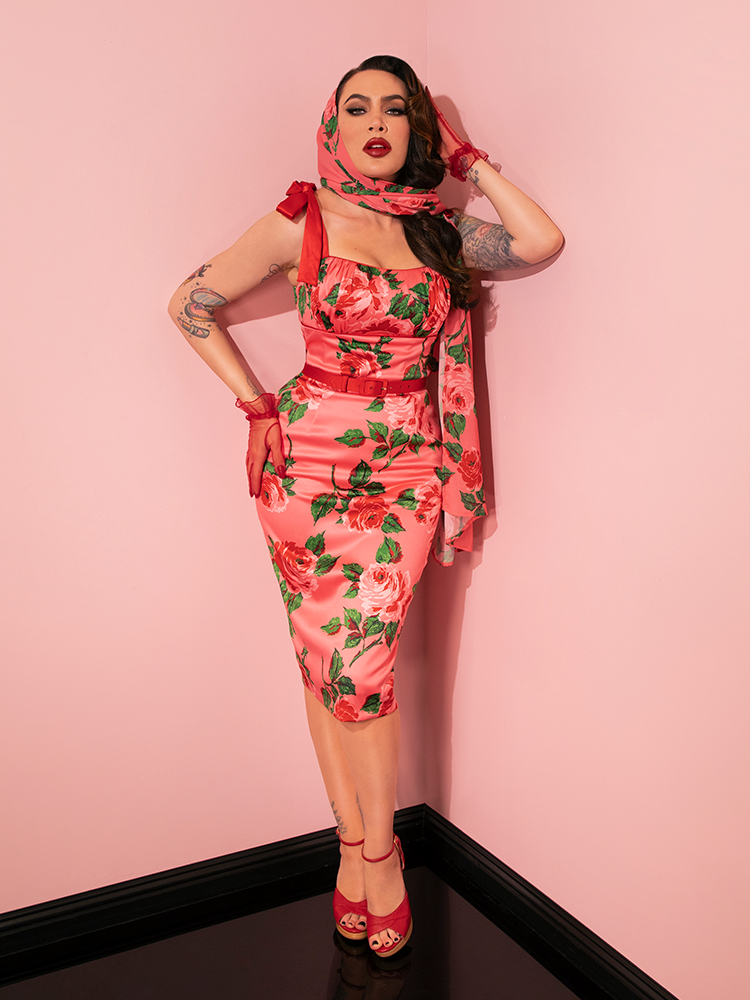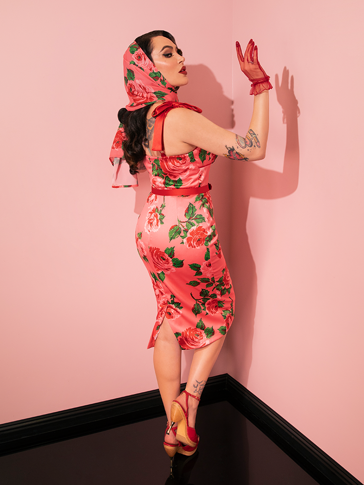 1950s Satin Wiggle Sundress and Scarf in Pink Vintage Roses - Vixen by Micheline Pitt