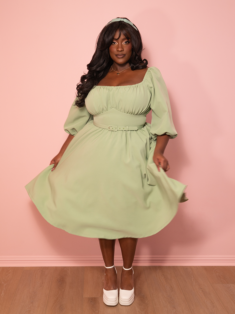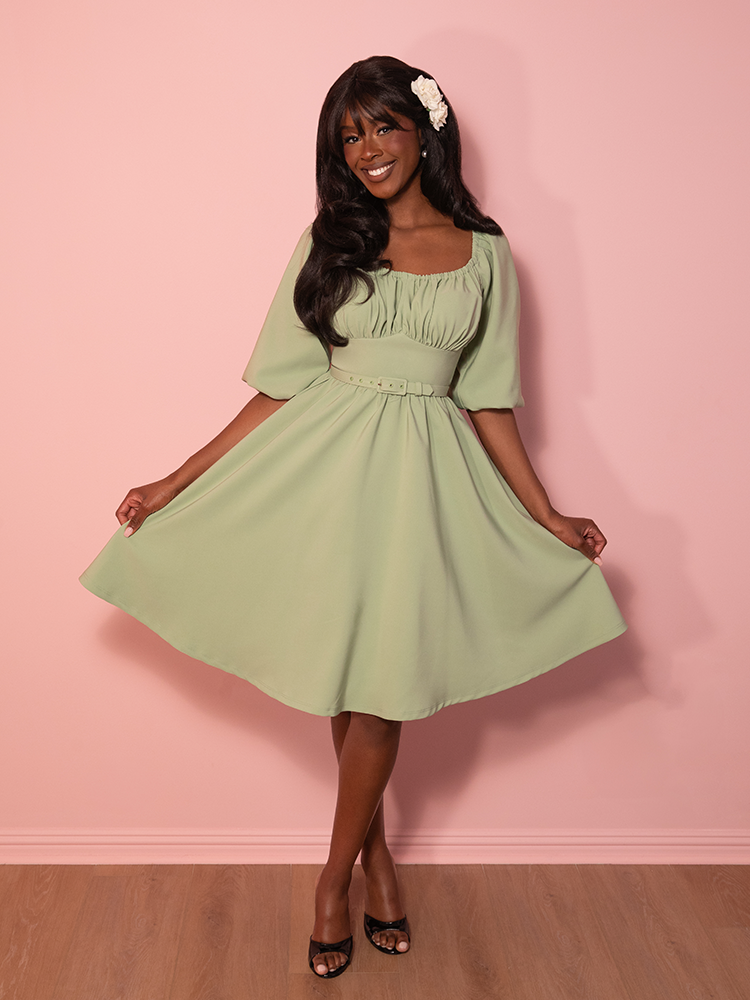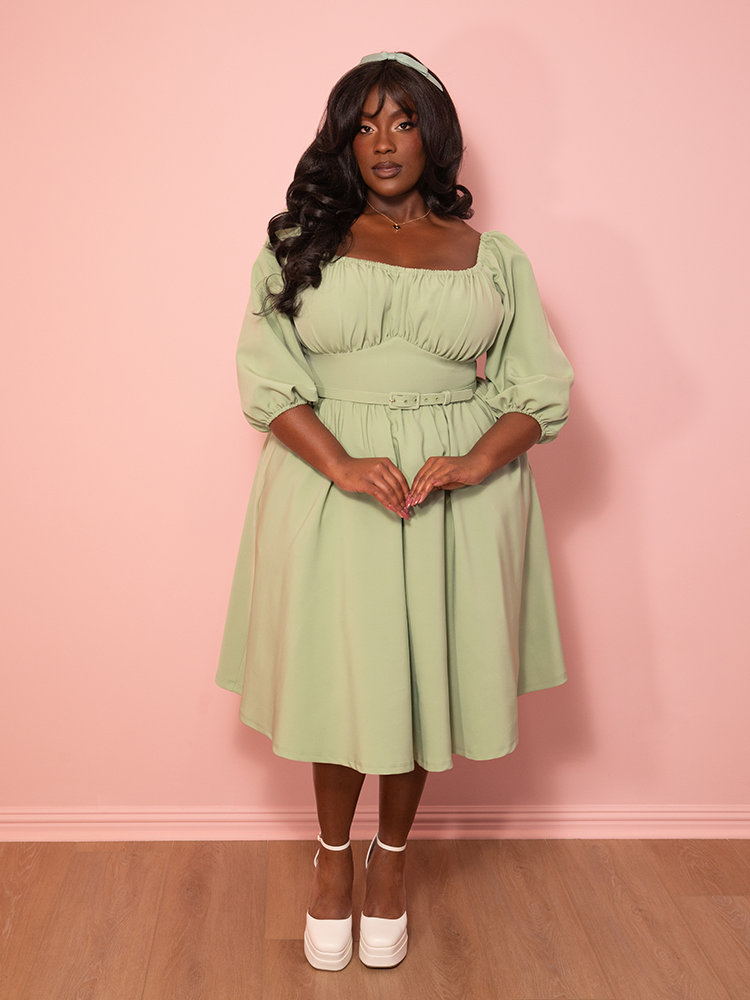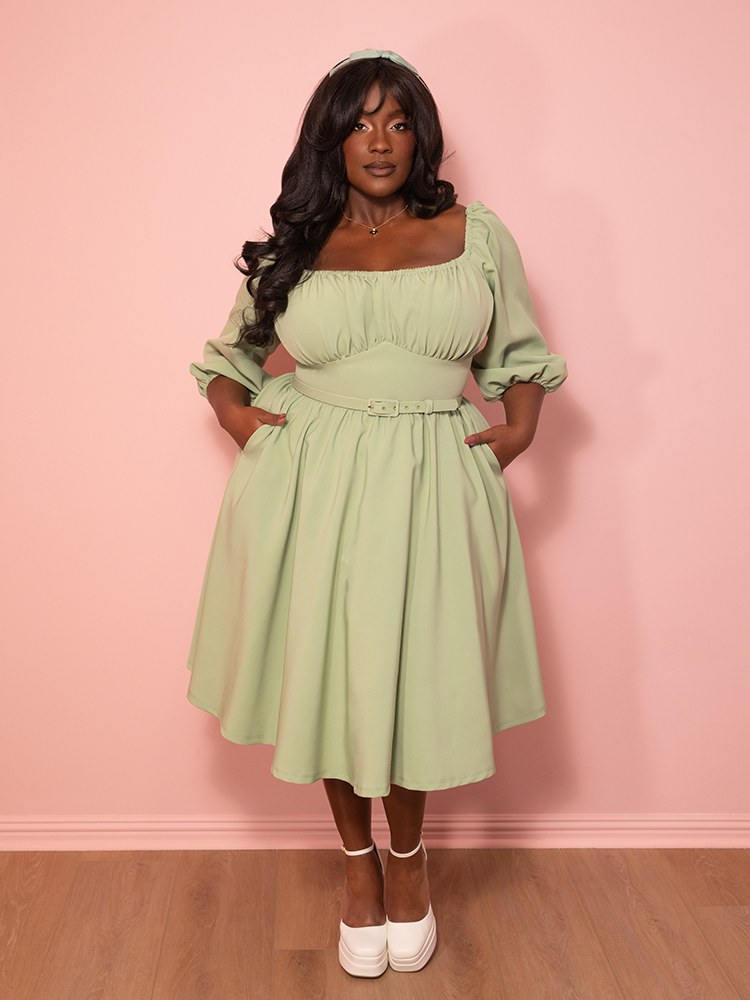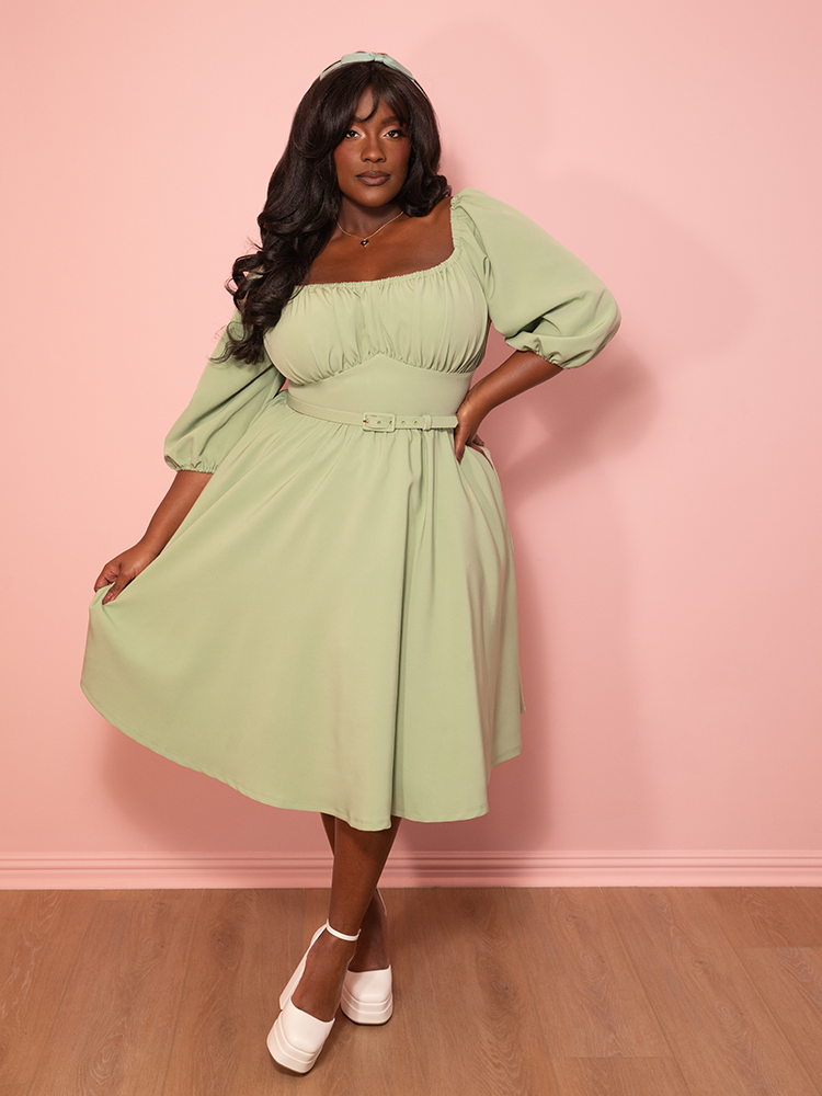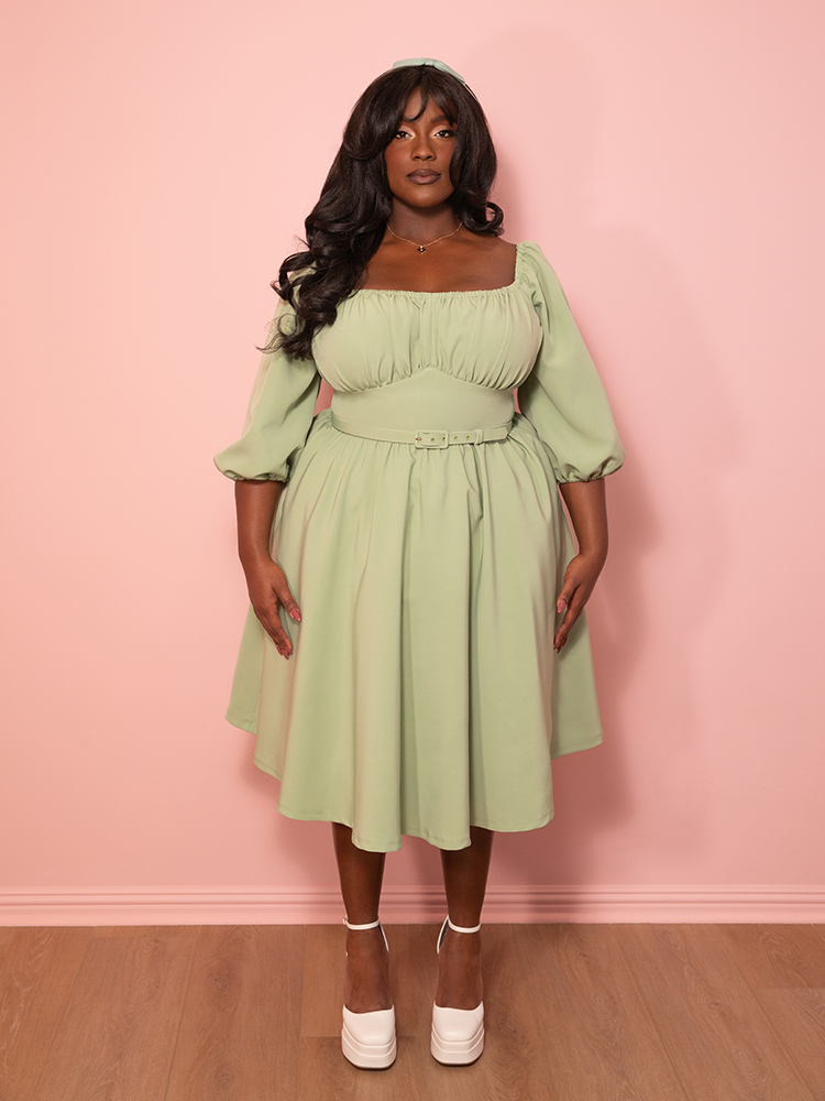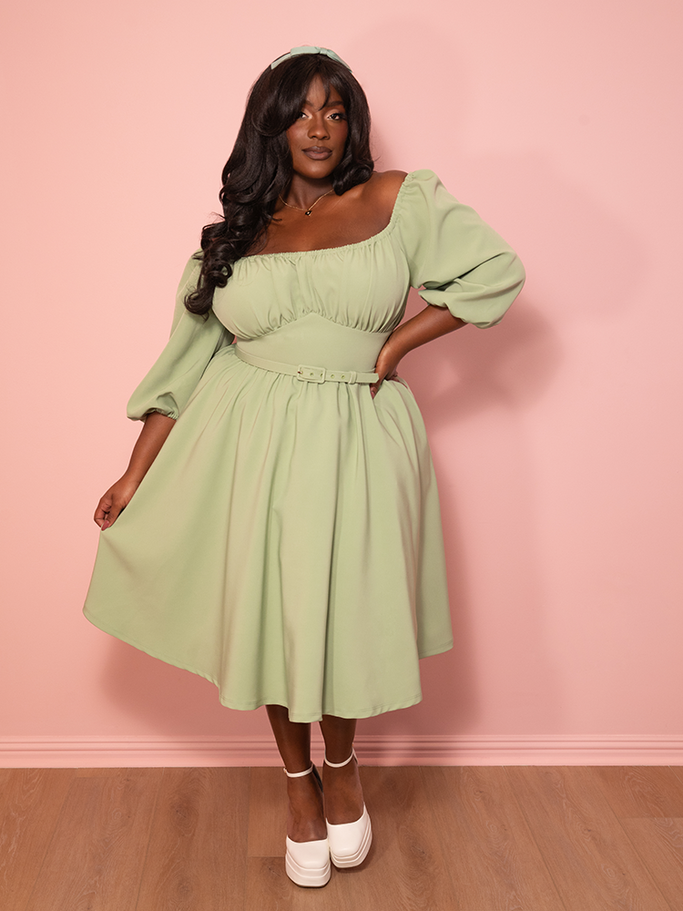 The Vacation is the ultimate sexy 1960s-inspired dress and is now available in a beautiful matcha shade! Perfect for Disneybounding! This dress is completely wrinkle-resistant and designed for travel. Made from the softest high-quality synthetic gaberdine spandex twill on the market. The bust features a sexy yet wearable elasticized gathered neckline and 3/4 length bishop sleeves for ultimate comfort and wearability. The Vacation dress has a slightly shirred waist that does not add volume and did we mention it has pockets!? The dress is finished with an invisible back zip and a removable 5/8 inch grommet belt.