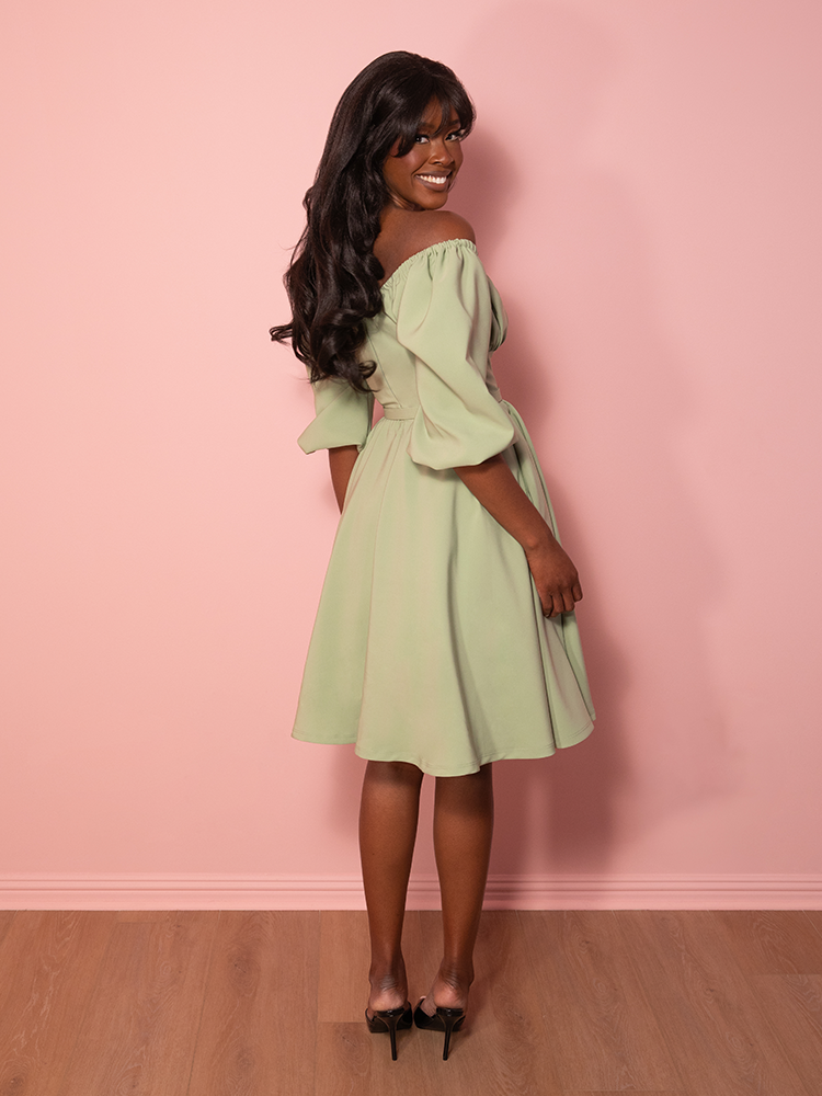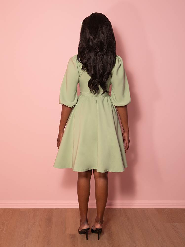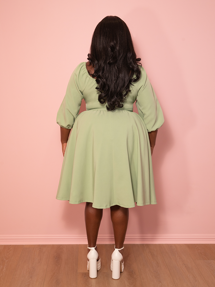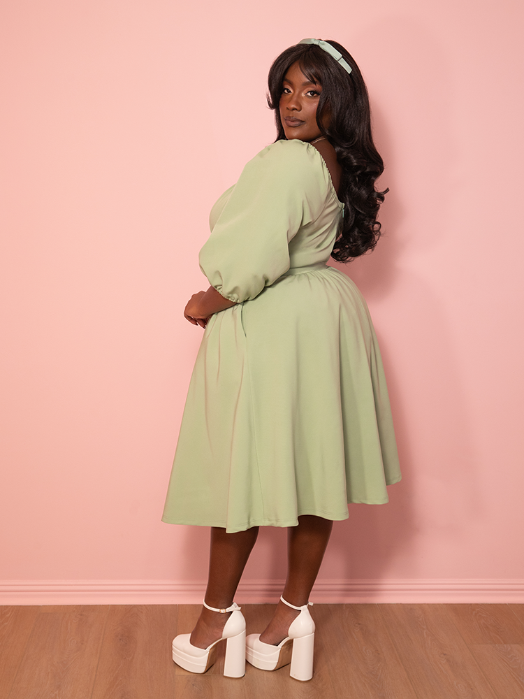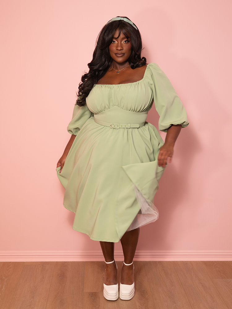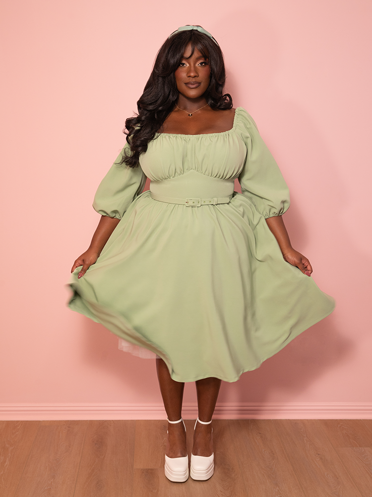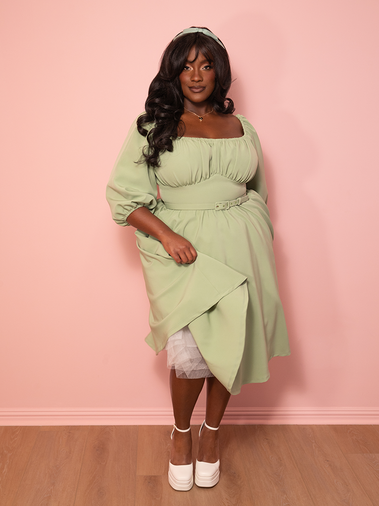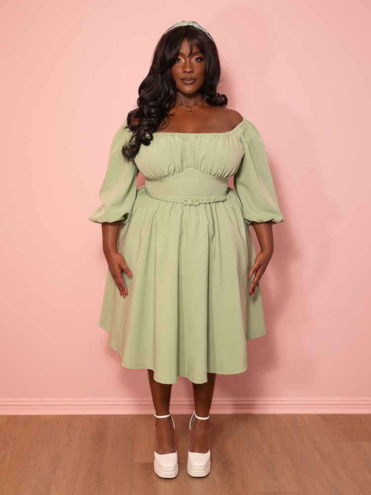 The Vacation is the ultimate sexy 1960s-inspired dress and is now available in a beautiful matcha shade! Perfect for Disneybounding! This dress is completely wrinkle-resistant and designed for travel. Made from the softest high-quality synthetic gaberdine spandex twill on the market. The bust features a sexy yet wearable elasticized gathered neckline and 3/4 length bishop sleeves for ultimate comfort and wearability. The Vacation dress has a slightly shirred waist that does not add volume and did we mention it has pockets!? The dress is finished with an invisible back zip and a removable 5/8 inch grommet belt.